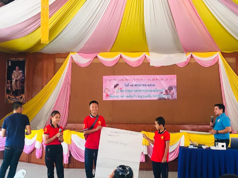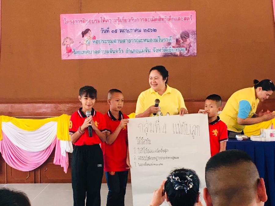 วันที่ 15 พ.ค. 2562 เทศบาลตำบลจันจว้า ดำเนินโครงการฝึกอบรมให้ความรู้เกี่ยวกับการละเมิดสิทธิเด็กและสตรี เพื่อพัฒนาความรู้เรื่องสิทธิและกฏหมายที่เกี่ยวข้องกับเด็กและสตรี เยาวชน การป้องกันและแก้ไขปัญหาความรุนแรงต่อเด็กและสตรี สนับสนุนการเฝ้่าระวังมิให้เด็กเข้าไปในสถานที่หรือท้องที่ใดอันจูงใจให้เด็กประพฤติตนมิสมควร ได้รับการสนุนวิทยากรจาก องค์การบริหารส่วนจังหวัดเชียงราย โดยมีกลุ่มเป้าหมาย เป็นเด็กนักเรียน โรงเรียนเทศบาล 2 และกลุ่มพัฒนาสตรีตำบลจันจว้า / จันจว้าใต้