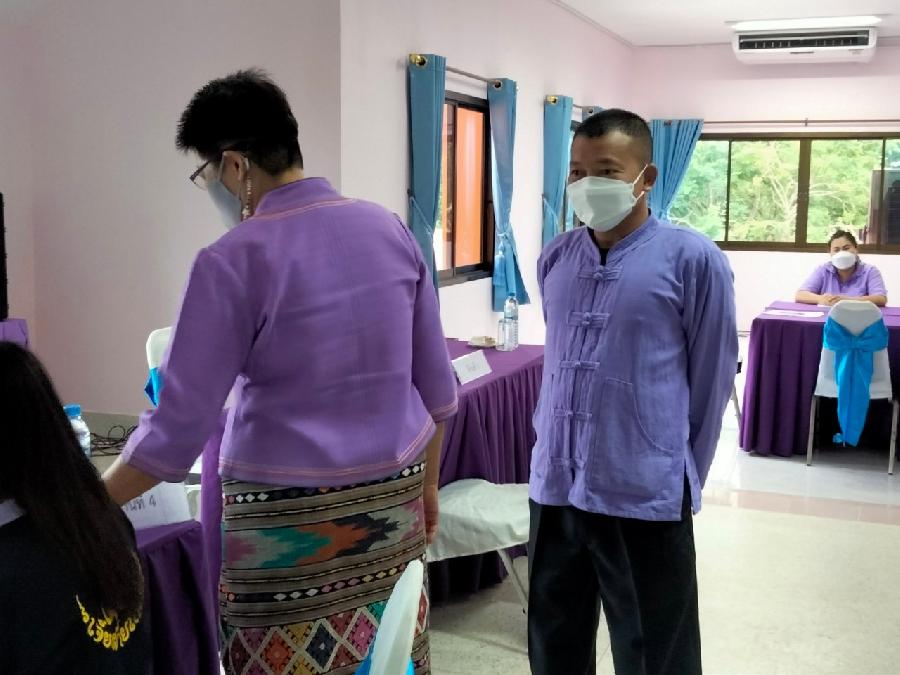 นายอรัญ จินดาธรรม รองนายกเทศมนตรีตำบลจันจว้า ประธานในพิธีเปิดโครงการรณรงค์ป้องกันและควบคุมโรคติดต่อ(สตรีไทย ต้านภัยโควิด 19) ณ ศาลาวัดบ้านห้วยน้ำราก หมู่ 5 ต.จันจว้า