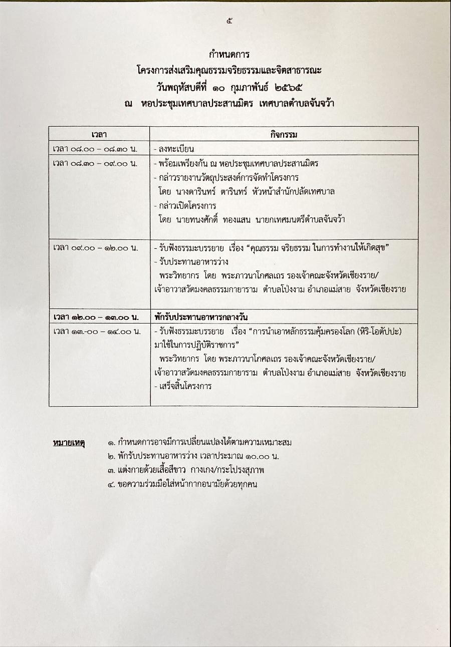 วันที่ 10 กุมภาพันธ์ 2565 นายทนงศักดิ์ ทองแสน นายกเทศมนตรีตำบลจันจว้า ประธานเปิดโครงการส่งเสริมคุณธรรมจริยธรรม หัวข้อการบรรยาย เรื่อง “คุณธรรม จริยธรรม ในการทำงานให้เกิดสุข” โดยมีการดำเนินการส่งเสริมคุณธรรมจริยธรรมและจิตสาธารณะ และสร้างค่านิยมในการปฏิบัติงานอย่างซื่อสัตย์สุจริต มีจิตสำนึกที่ดี รับผิดชอบต่อหน้าที่ตามมาตรฐานทางจริยธรรมของเจ้าหน้าที่ของรัฐ ผู้เข้าร่วมโครงการประกอบด้วย คณะผู้บริหาร สมาชิกสภาเทศบาล พนักงานเทศบาล พนักงานครูเทศบาล ลูกจ้างประจำ พนักงานจ้าง ณ หอประชุมเทศบาลประสานมิตร (เปิดดู 2,316)