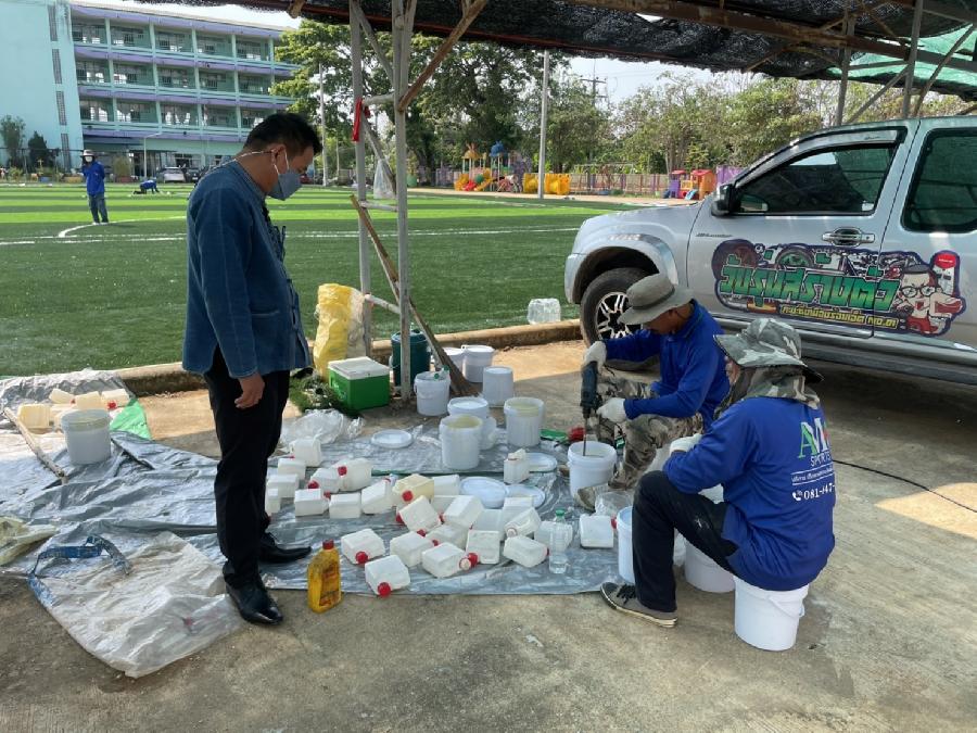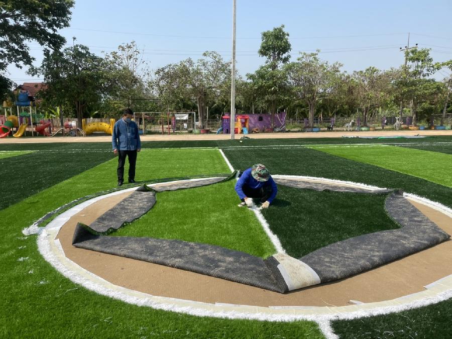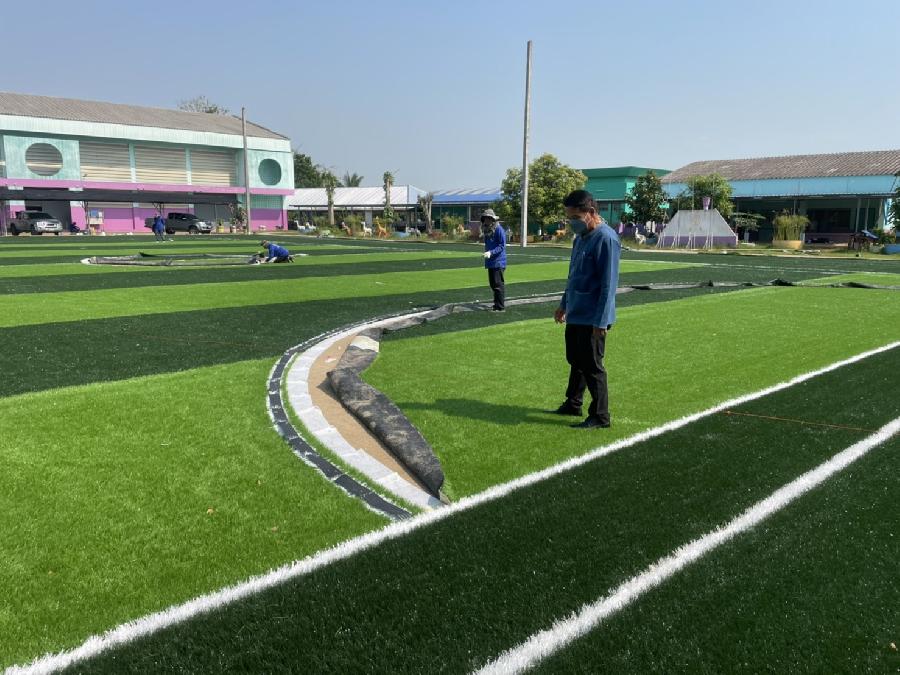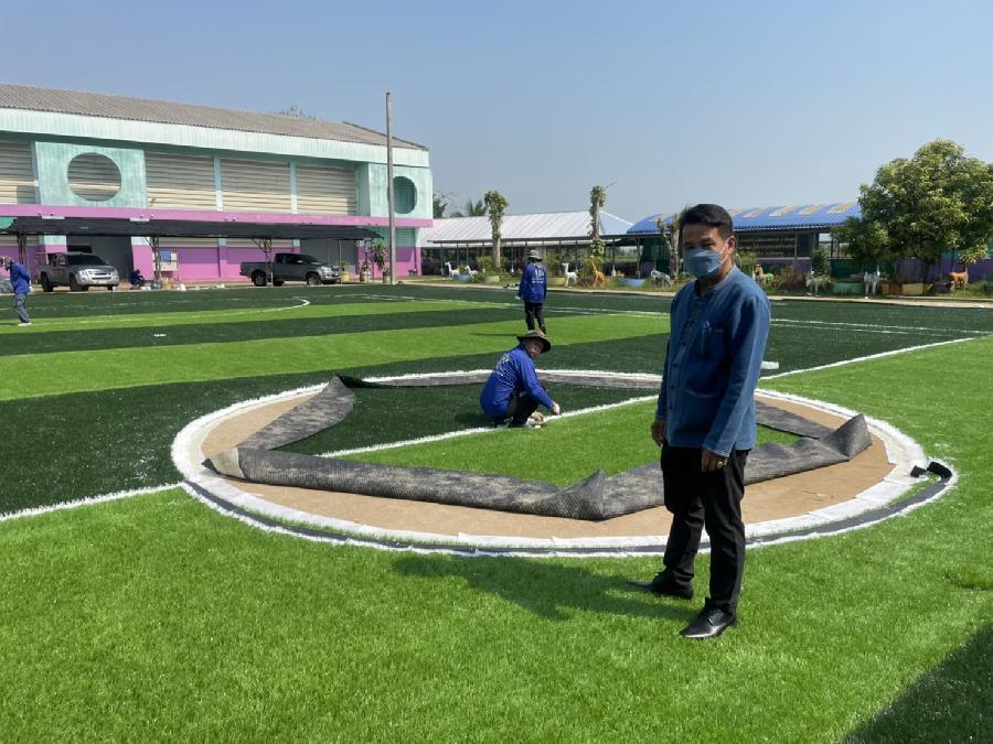 8/4/65 นายทนงศักดิ์ ทองแสน นายกเทศมนตรีตำบลจันจว้า ติดตามความก้าวหน้าของการปูหญ้าเทียมสนามฟุตบอล ณ โรงเรียนเทศบาล1 ต้นยาง