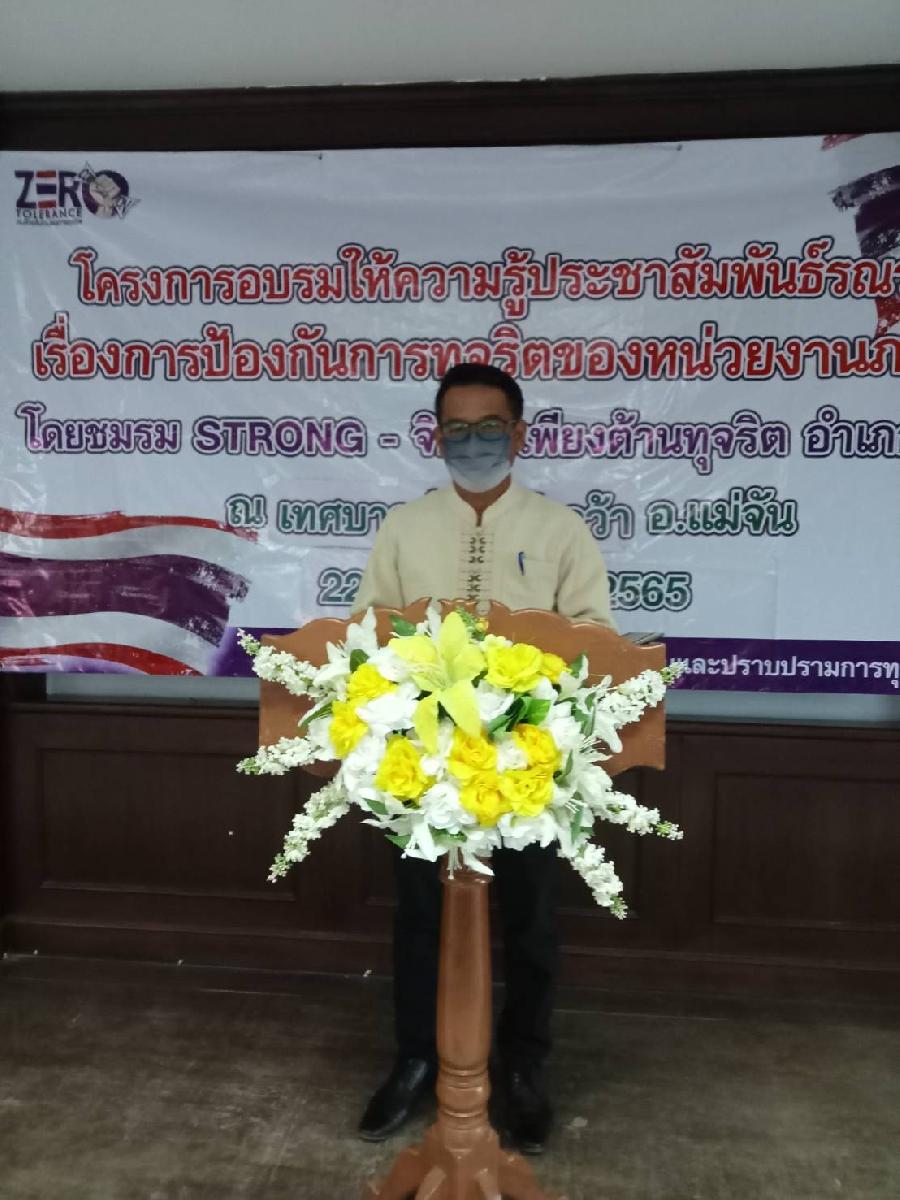 22 สิงหาคม 2565 เทศบาลตำบลจันจว้า โดยนายทนงศักดิ์ ทองแสน นายกเทศมนตรีตำบลจันจว้า สมาชิกสภาเทศบาล หัวหน้าส่วนราชการ พนักงานเทศบาลและประชาชน ร่วมโครงการอบรมให้ความรู้ประชาสัมพันธ์รณรงค์ เรื่องการป้องกันการทุจริตของหน่วยงานภาครัฐ โดยชมรม STRONG จิตพอเพียงทุจริต อำเภอแม่จัน ณ ห้องประชุม 2 ชั้น 3 เทศบาลตำบลจันจว้า (เปิดดู 2,314)