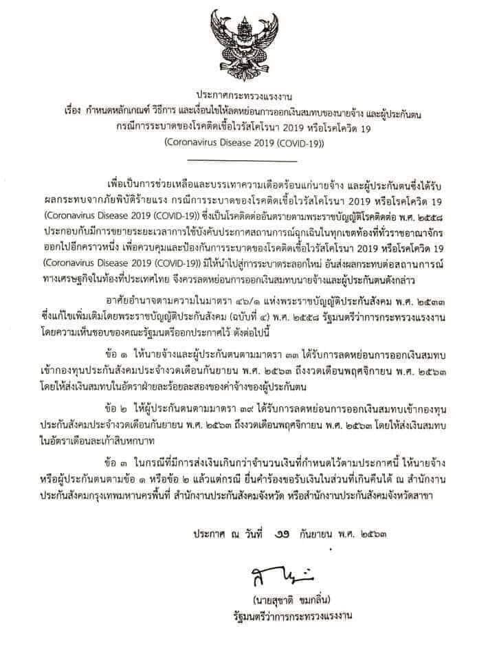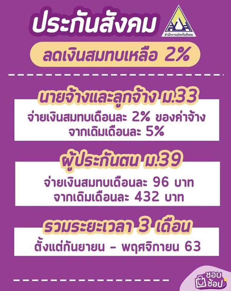 ประสัมพันธ์จากสำนักงานประกันสังคม ลดเงินหักนำส่ง ประกันสังคมทั้งฝ่ายลูกจ้างและนายจ้าง เหลือ 2% จากเดิม 5%