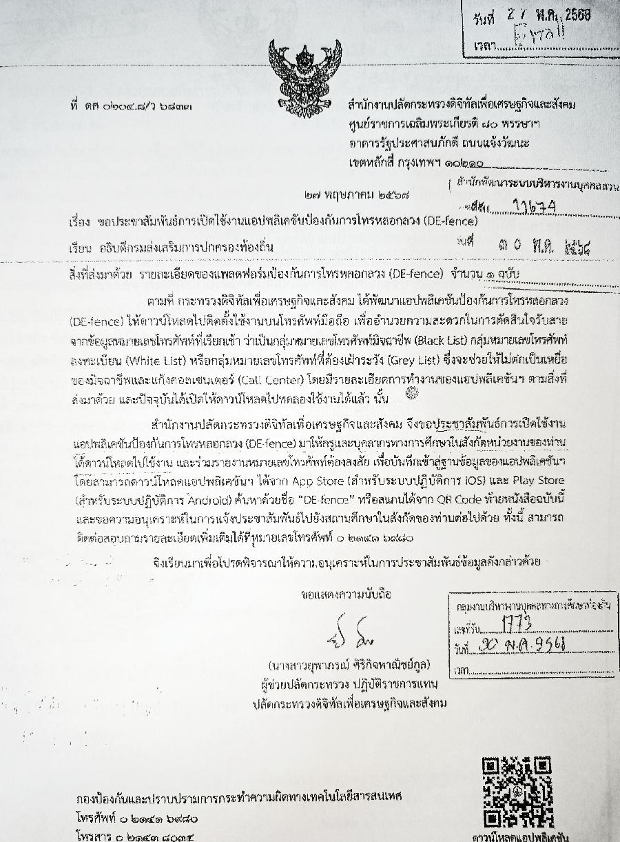 ประชาสัมพันธ์ จาก กระทรวงดิจิทัลเพื่อเศรษฐกิจและสังคม ขอเชิญชวนใช้งานแอปพลิเคชันป้องกันการหลอกลวง DE-fence เพื่อป้องกันมิจฉาชีพ แก๊งคอลเซ็นเตอร์