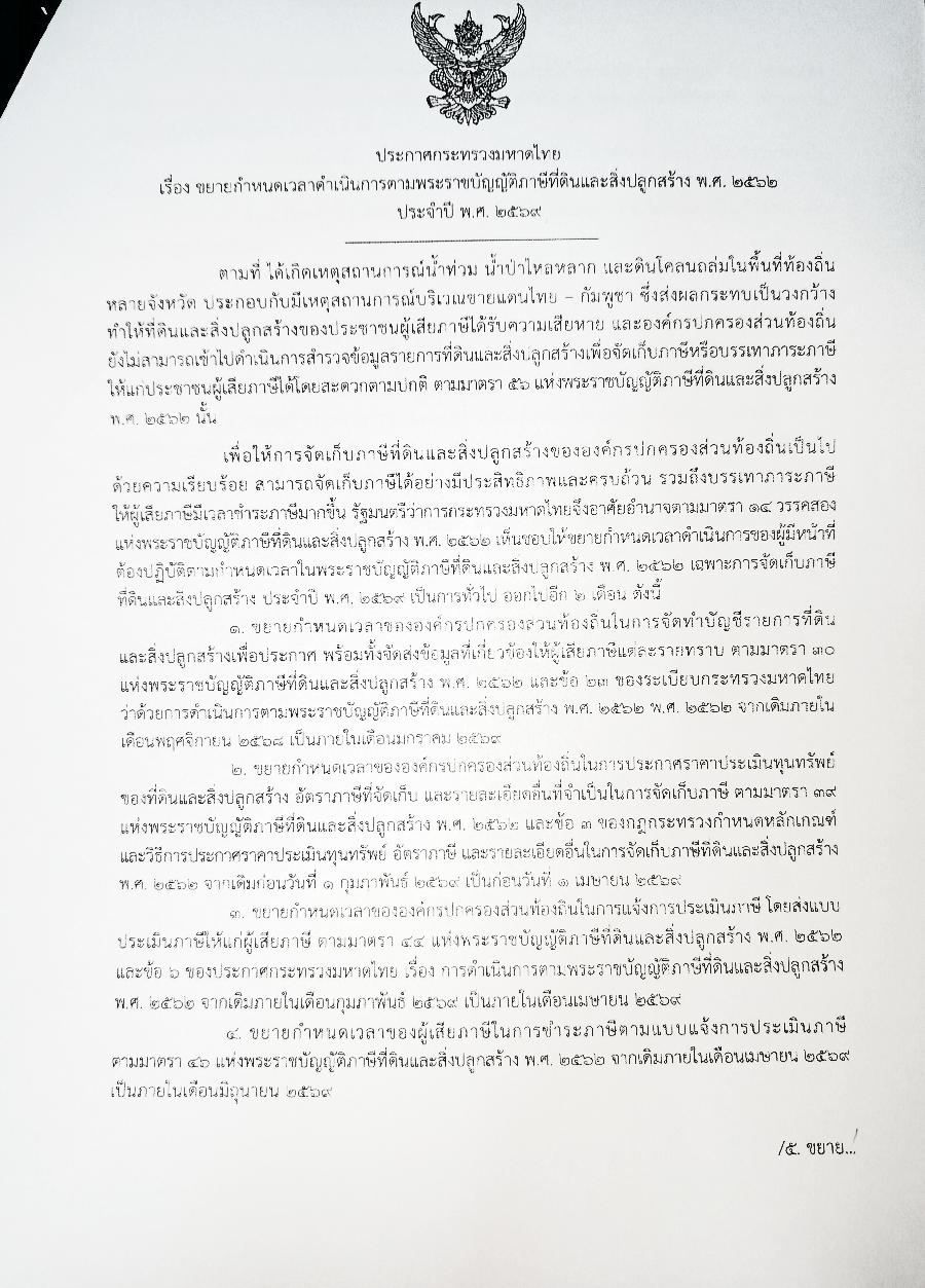 ประกาศกระทรวงมหาดไทย เรื่อง การขยายระยะเวลาการดำเนินการตามพระราชบัญญัติ ภาษีที่ดินและสิ่งปลูกสร้าง พ.ศ.2562 ประจำปี พ.ศ.2569