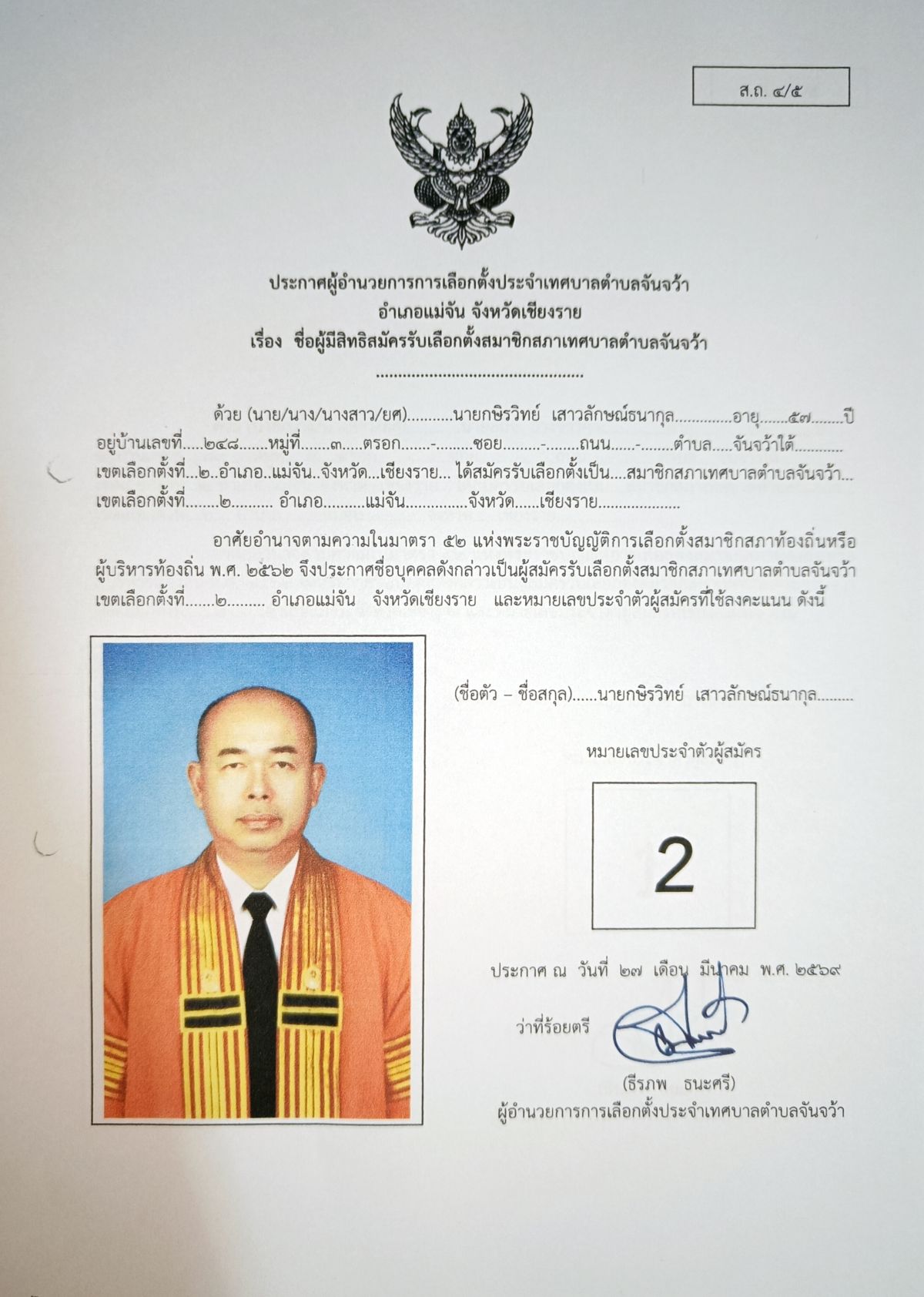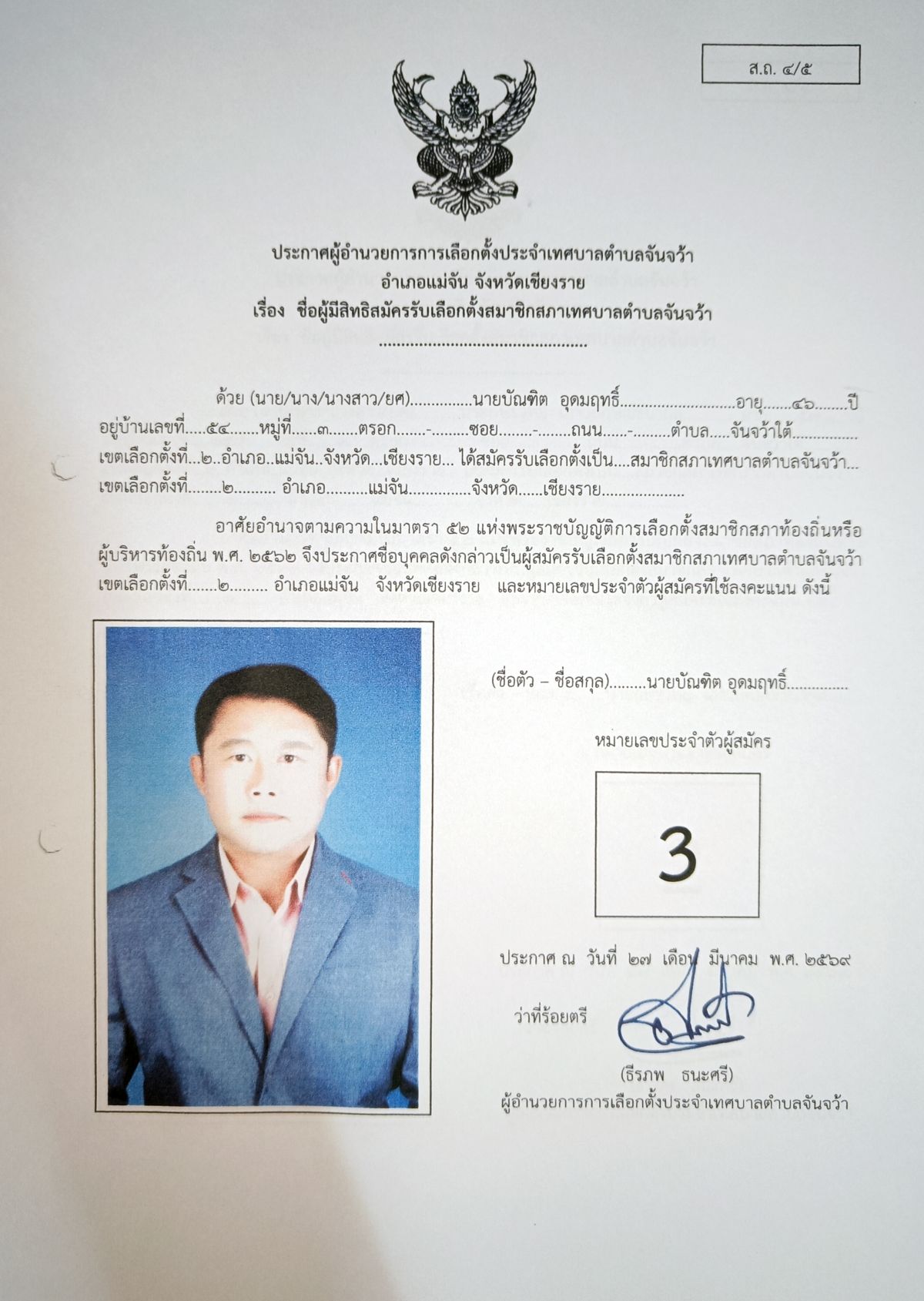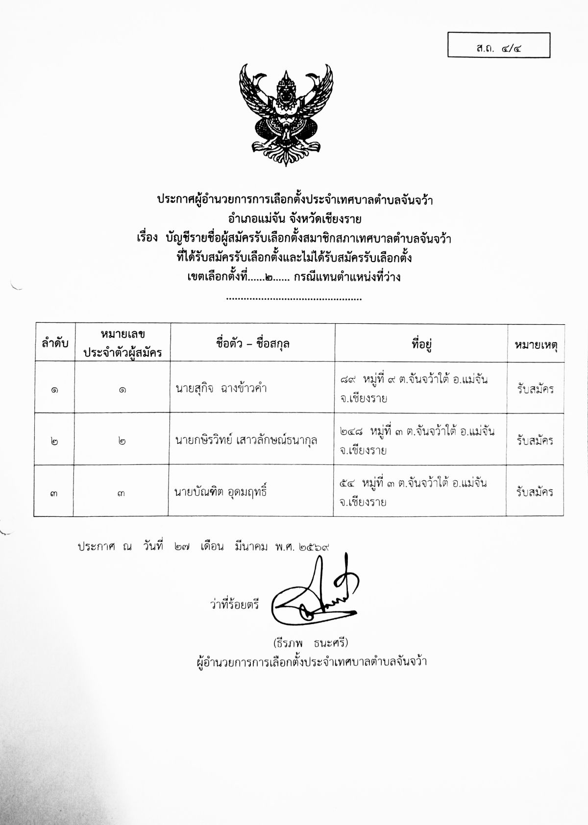 ประกาศผู้อำนวยการการเลือกตั้งประจำเทศบาลตำบลจันจว้า อำเภอแม่จัน จังหวัดเชียงราย เรื่อง บัญชีรายชื่อผู้สมัครรับเลือกตั้งสมาชิกสภาเทศบาลตำบลจันจว้า ที่ได้รับสมัครรับเลือกตั้งและไม่ได้รับสมัครรับเลือกตั้ง เขตเลือกตั้งที่ 2 กรณีแทนตำแหน่งที่ว่าง